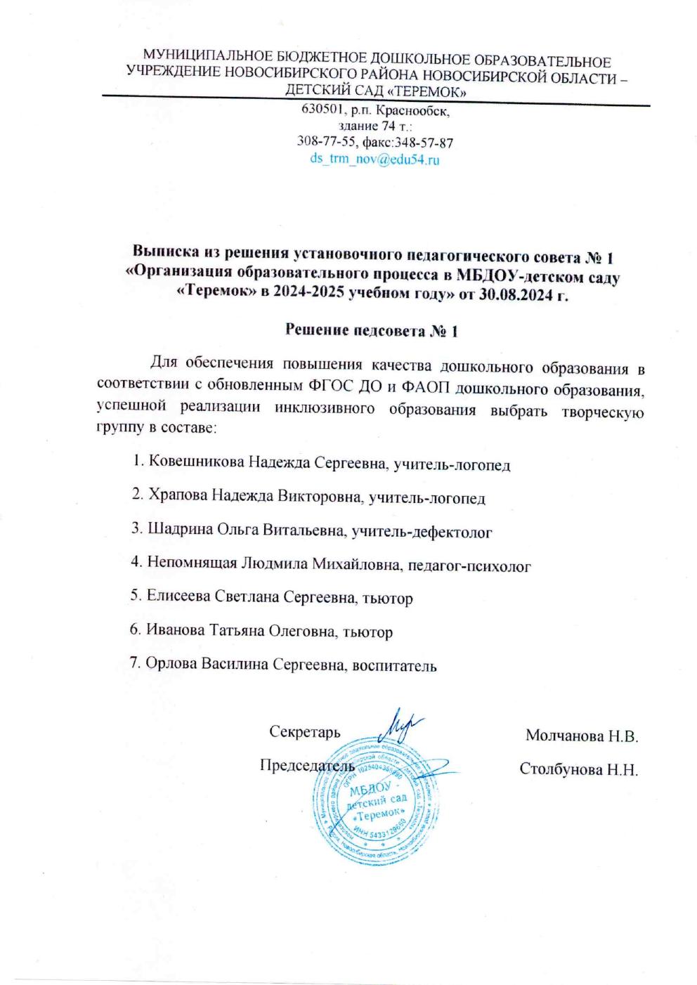 выписка из решения установочного пед.совета о включении в творческую группу для успешной реализации инклюзивного образования