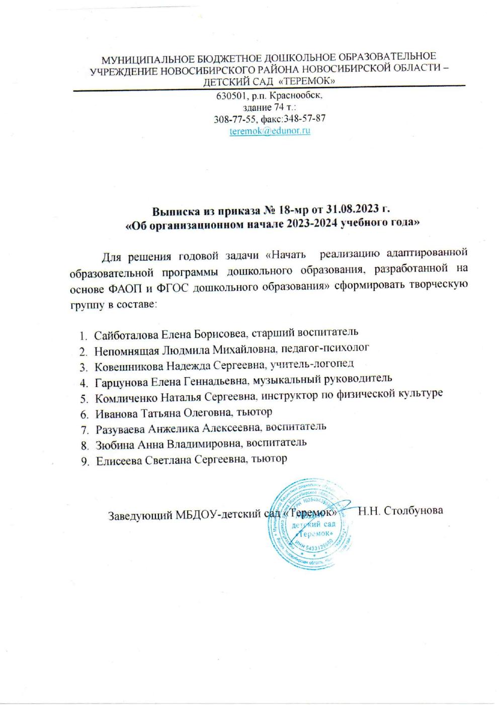 Выписка из приказа "Об организационном начале 2023-2024 учебного года"